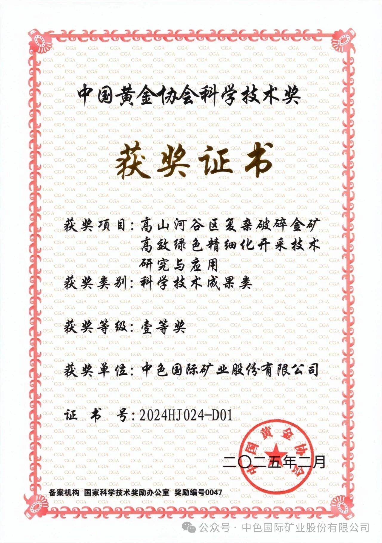 公司荣获中国黄金协会科学技术一等奖